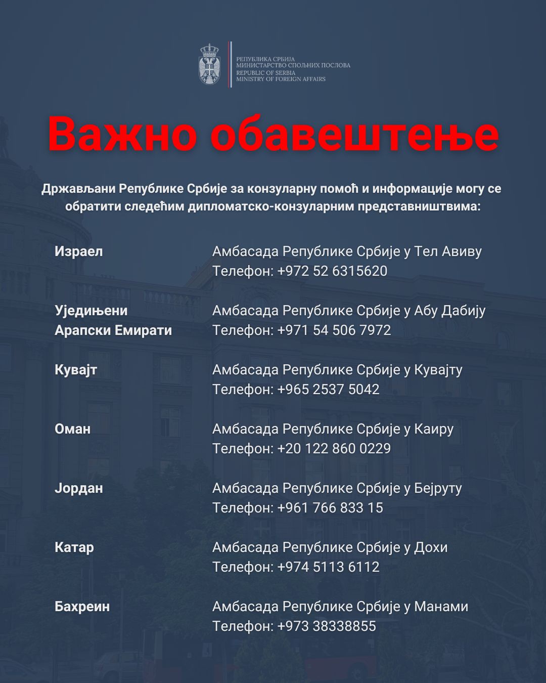 Državljani Republike Srbije koji se nalaze u regionu Bliskog istoka, radi konzularne pomoći i dobijanja dodatnih informacija, mogu se obratiti sledećim diplomatsko-konzularnim predstavništvima: